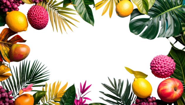 Vibrant tropical fruits and lush green leaves create colorful frame, showcasing lemons, lychees, mangoes, and more, evoking fresh and lively atmosphere