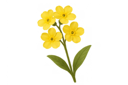 Yellow primrose flower illustration with green leaves, spring botanical plant design element on transparent background