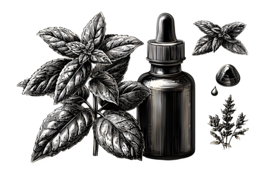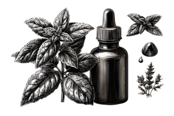 Vintage Botanical Mint Herb Vector Set Engraving Style Glass Apothecary Bottle Dropper Falling Droplet Textured Leaves Flowering Stalks Black Ink Line Art Herbal Labels Aromatherapy Branding Culinary