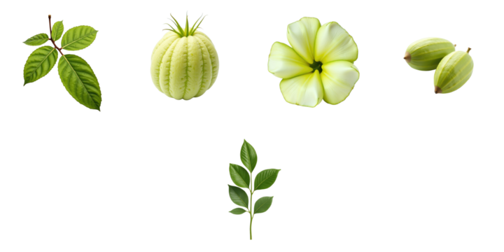 Detailed close-up of tropical almond plant components including leaves, fruits, and flowers isolated on transparent background for botanical illustration and study purposes.