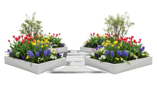 White background with a garden of flowers and a path. isolated illustration on transparent background