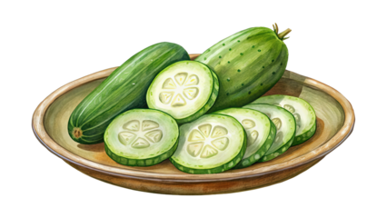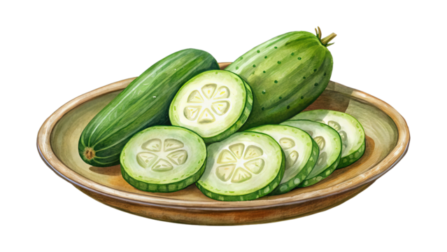 Watercolor painting of fresh cucumbers, both whole and sliced, on a plate