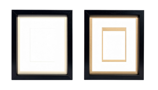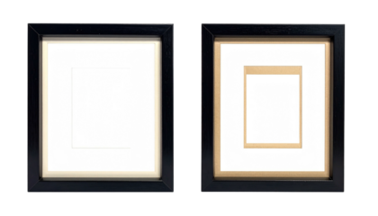 Two black frames, both square, hang side-by-side; left has a larger blank space than the one on the right