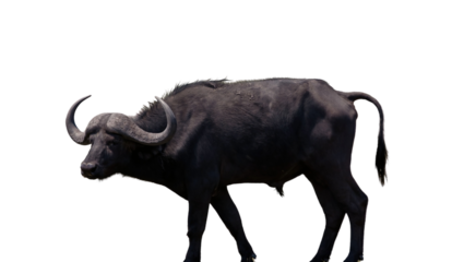 African buffalo isolated on white transparent, safari animal with horns