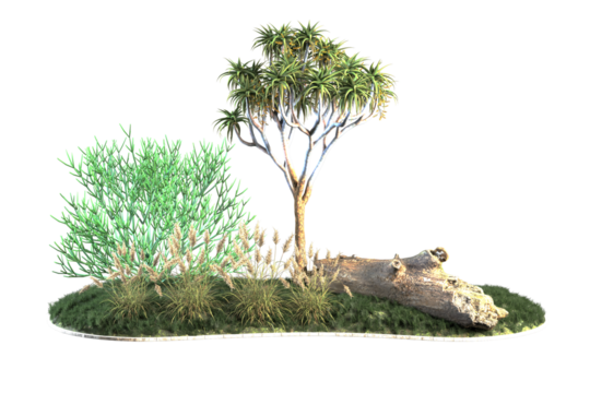 Vegetation scene featuring a quiver tree and a log.