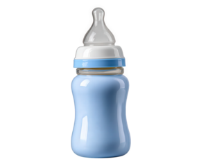 Blue baby bottle with silicone nipple, plastic body, and white cap, designed for newborn feeding and infant care, isolated on transparency background, clean and modern style