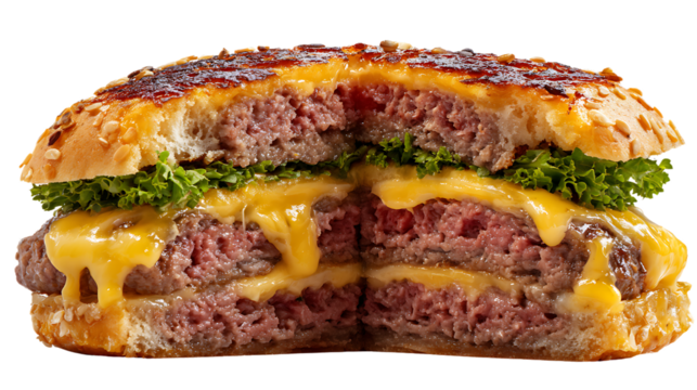 Deliciously crafted vegetarian burger cut in half showcasing fresh avocado slices lettuce tomato and a hearty plant based patty on a sesame bun on transparent background