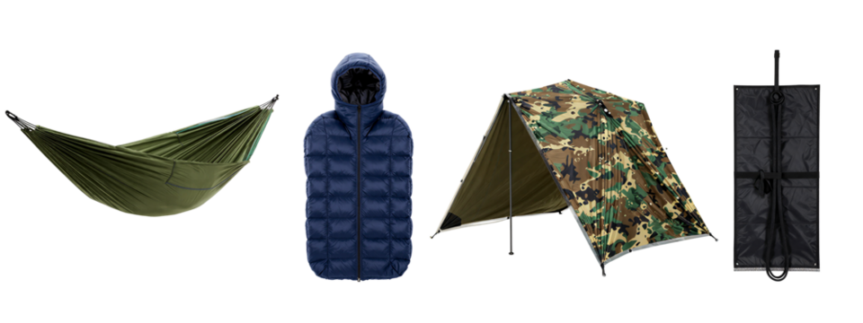 Photograph of four camping items: green hammock, blue puffy vest, camouflage umbrella, black rain cover, all on.