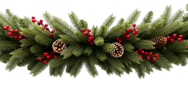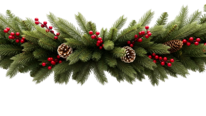 A festive Christmas garland features green evergreen branches, natural pinecones, and vibrant red berries, isolated on a transparent PNG background.