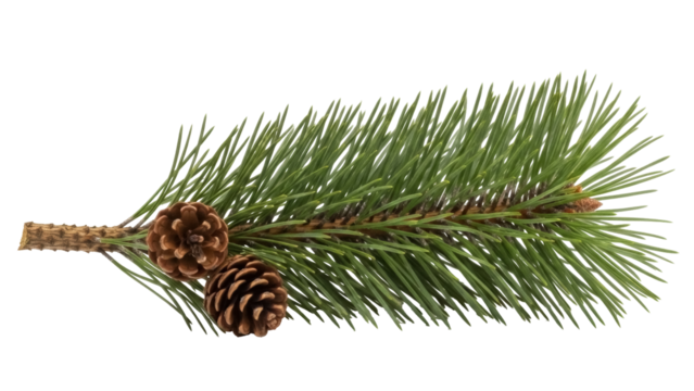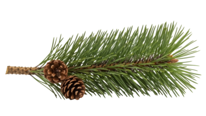 Isolated Pine branch, natural evergreen bough with two pinecones, forest decoration element