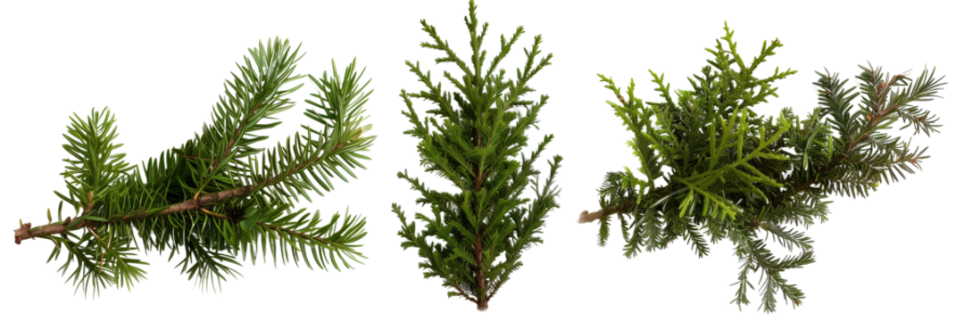 set of spruce boughs, lush and needle-like, isolated on transparent background