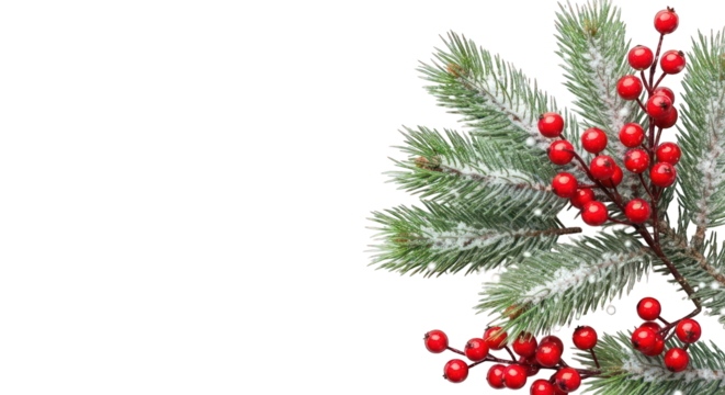 Meticulously crafted repeating horizontal border of emerald green pine boughs with sharp needles, brown stems, and tiny silver baubles, isolated on transparent, copy space, concept of festive