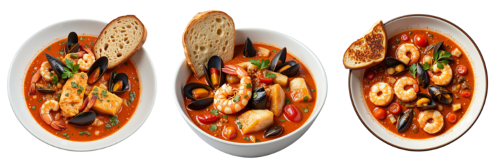 PNG set Hearty Seafood Bouillabaisse Soup with Shrimp, Mussels and Vegetables Isolated on Transparent background