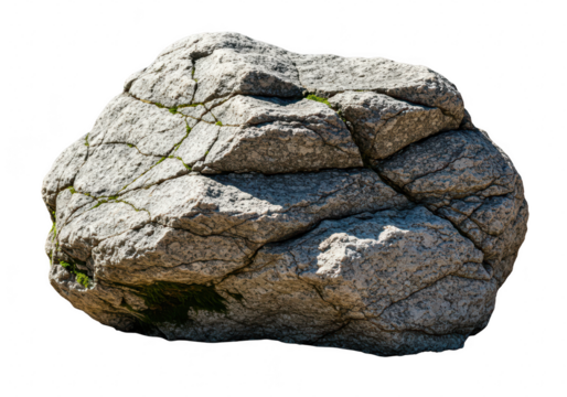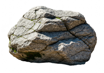 A large, rough granite boulder with cracks and moss, isolated on a transparent background