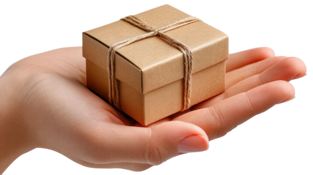 Gift in Hand: A close-up shot showcases a delicate gift box, bound securely, resting gently in an open hand, evoking anticipation and generosity.