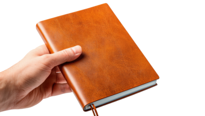 Close-up of a hand holding a new, closed leather bound journal with a bookmark