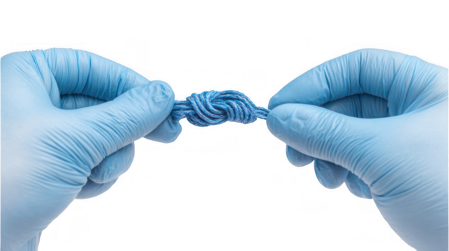Two hands in blue nitrile gloves tying a knot with light blue string on a transparent background, ideal for concepts in medicine and sterile procedures