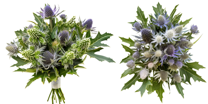 set of bouquet made with Sea Holly flowers, isolated on transparent background
