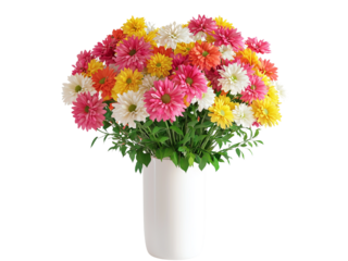 A vibrant bouquet of colorful flowers in a white vase, showcasing a mix of pink, yellow, and white blooms. isolated on white background and transparent background