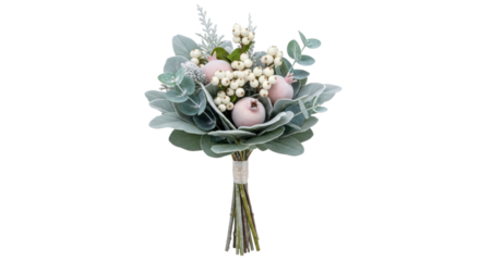 Scenic bouquet with blossoms, berries, and tape on clear background
