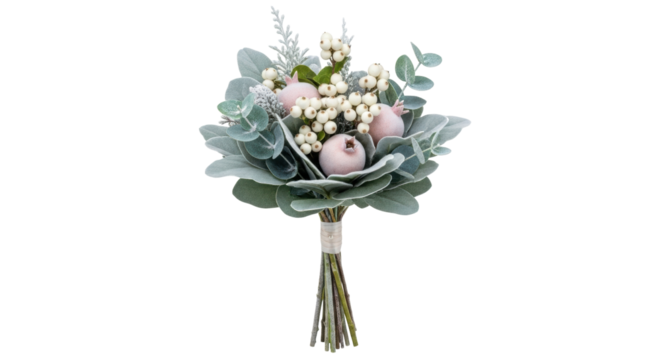 Isolated bouquet with pink pomegranates and white berries for festive winter decor