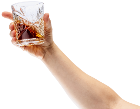 Cheers. One hand holds glass of whiskey or bourbon against transparent background. Concept of alcohol drinks parties, Friday mood, restaurant, bar and pubs, celebration. Ad