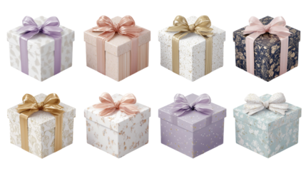 Elegant Gift Boxes with Ribbons in Soft Colors and Various Designs, PNG bundle collection, Isolated on transparent Background