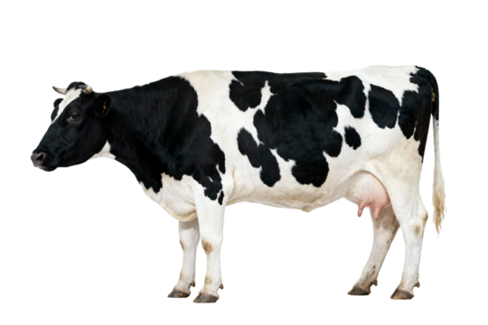A black and white dairy cow standing on an isolated background looking directly at the camera