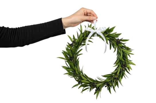 A woman's hand in a black sleeve holds a beautiful festive wreath made of fresh green leaves and dark berries, tied with a white satin bow and isolated on a black background
