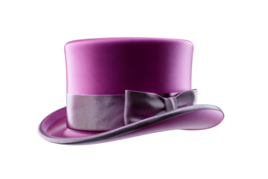 A sleek, tall, black top hat with a satin ribbon band and small bow, isolated against a plain black background