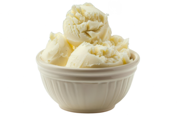 Delicious scoops of creamy vanilla ice cream in a white bowl isolated on a white background, perfect for dessert presentations and food-related projects.