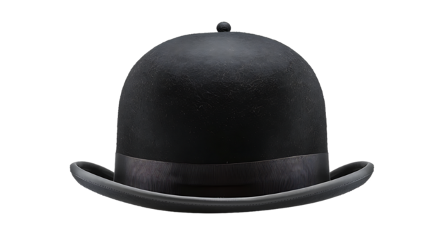 A classic black bowler hat resting on a white background, showcasing its rounded shape and smooth texture, ideal for vintage fashion or costume design