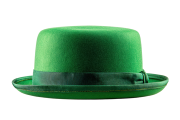 Vibrant green bowler hat with matching ribbon encircles crown, showcasing classic and stylish design. hat smooth texture and bright color make it standout accessory