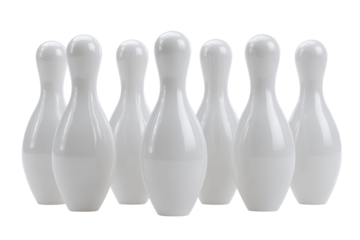 Group of seven white bowling pins arranged in a semi-circle on black background sport game