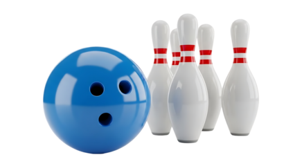 Blue bowling ball and pins isolated PNG, sport equipment for leisure activity and recreation on transparent background