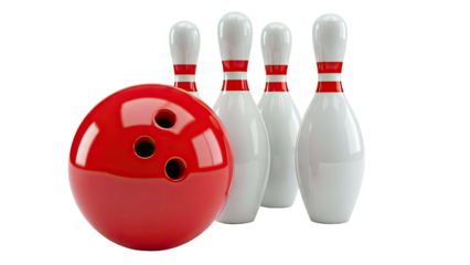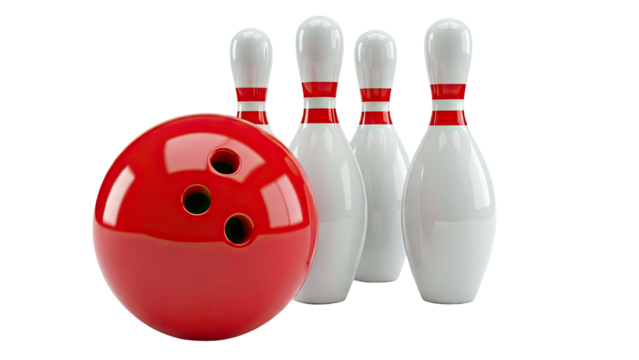 Red and white bowling ball with white pins with red stripes isolated on a transparent background bowling pins