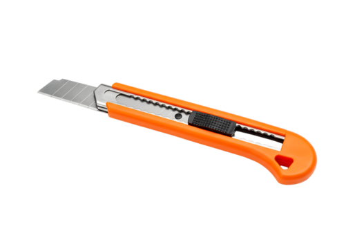 Orange Box Cutter: A clean, sharp box cutter with a bright orange handle lies isolated, symbolizing precision and craftsmanship in a minimalist setting.