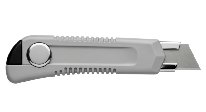 Yellow utility knife with extended blade, precision cutting tool gleaming against transparent backdrop, ideal for design layouts