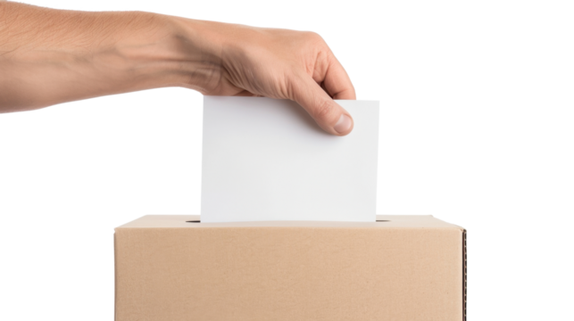 A white ballot paper marked "VOTE" is being inserted into a simple, square, beige voting box.