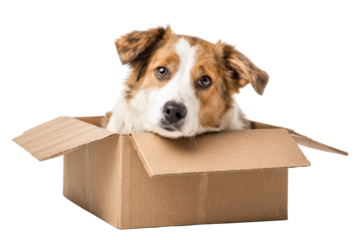 Dog in Cardboard Box Isolated on Transparent Background