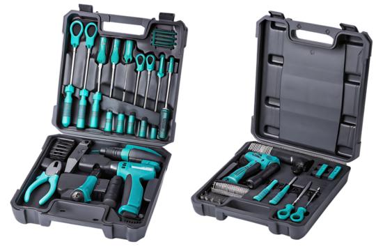 Open case box filled with turquoise blue tools isolated on a transparent background