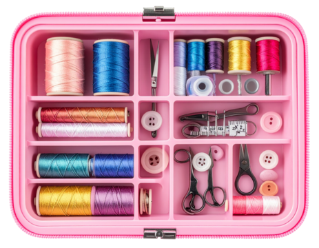 Compact Pink Sewing Kit with Colorful Spools and Tools, Isolated on Transparent Background PNG