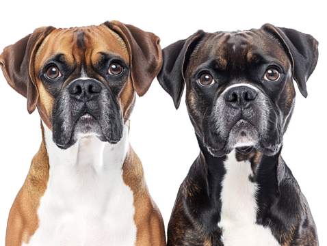 Boxer dog isolated on transparent background, a portrait of a purebred canine with brown and white markings, looking up attentively