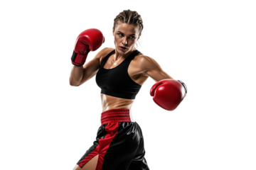 Athletic female boxer ready for the match, focused expression, fists up, isolated on white background.