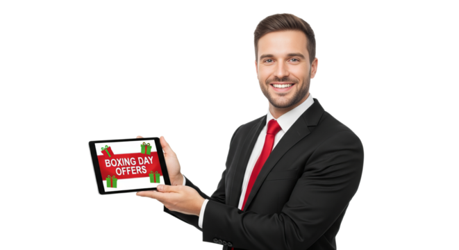 Man in black suit showcases special offers on tablet for Boxing Day promotion