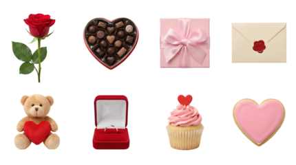 Valentine's day romantic gift set including rose, chocolate box, gift, letter, teddy bear, ring, cupcake, and cookie isolated. Holiday celebration and anniversary collection.