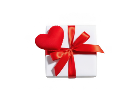 A white gift box with a red ribbon and heart on top isolated on transparent background for valentines day