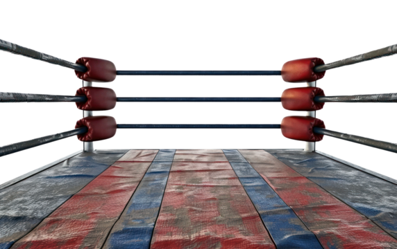 Empty boxing ring with red ropes on transparent background