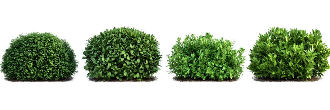 Photorealistic green shrubs and ornamental plants in a symmetrical arrangement, featuring detailed foliage and boxwood topiary, isolated PNG on transparent BG, perfect for landscape design elements