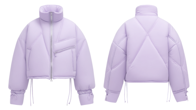 This cropped boxy puffer jacket in light purple features a high collar and functional zip pocket, ideal for chilly days and fashionable outings